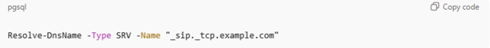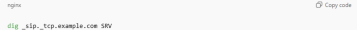 This output shows the server that will handle SIP connections, its priority, weight for load balancing, and the port number.