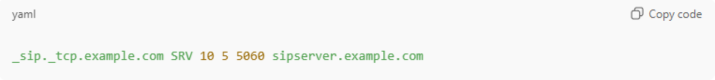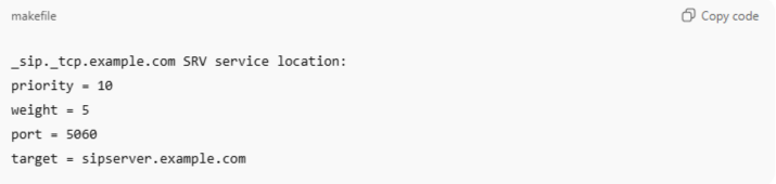 means clients will first try the server sipserver.example.com on port 5060, and if multiple servers have the same priority, traffic is split according to the weight value.