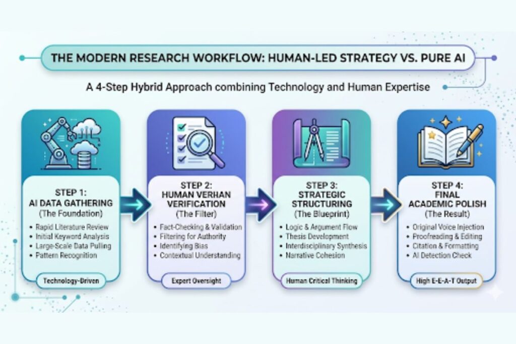 Pure AI tends to hallucinate or rely on outdated datasets, leading to citations that don’t exist or theories that have been debunked. Human led strategy involves “Information Gain.”